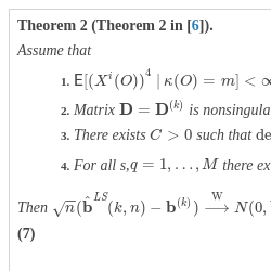 The following theorem provides conditions for the asymptotic normality and describes the dispersion matrix of the estimator ${\hat{\mathbf{b}}}^{\mathit{LS}}(k,n)$. Theorem 2 (Theorem 2 in [6]).
