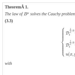 \[ \left\{\begin{aligned}{}& {\mathcal{D}_{t}^{\frac{1}{2},\eta }}u+\sqrt{\eta }\hspace{0.1667em}u=a(x,y)\bigg(\frac{\partial u}{\partial x}+\sqrt{\eta }\hspace{0.1667em}u\bigg),\hspace{1em}t>0,\hspace{0.2778em}x,y,\in \mathbb{R},\\ {} & {\mathcal{D}_{t}^{\frac{1}{2},\eta }}u+\sqrt{\eta }\hspace{0.1667em}u=-a(x,y)\bigg(\frac{\partial u}{\partial y}-\sqrt{\eta }\hspace{0.1667em}u\bigg),\hspace{1em}t>0,\hspace{0.2778em}x,y,\in \mathbb{R},\\ {} & u(x,y,0)=\delta (x-y)\end{aligned}\right.\]Proof.
