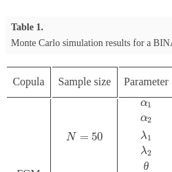 | FGM | $N=50$ | ${\alpha _{1}}$ | 0.6 | 0.01895 | −0.05858 | 0.00845 | −0.01513 | – | – |