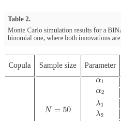 \[\begin{aligned}{}C({u_{1}},{u_{2}};\theta )& =\max {\big\{{u_{1}^{-\theta }}+{u_{2}^{-\theta }}-1,0\big\}^{-\frac{1}{\theta }}},\end{aligned}\]4 Parameter estimation of the copula-based BINAR(1) model