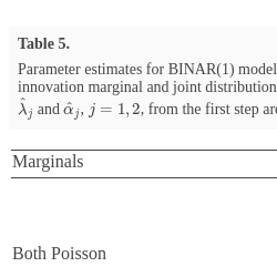 Finally, one can apply some other copulas in order to analyse whether the loan data exhibits different forms of dependence from the ones discussed in this paper. Lastly, the approach can be extended by analysing the presence of structural changes within the data, or checking the presence of seasonality as well as extending the BINAR(1) model with copula joined innovations to account for the past values of other time series rather than only itself.