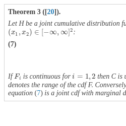 If ${F_{i}}$ is continuous for $i=1,2$ then C is unique; otherwise C is uniquely determined only on $\mathrm{Ran}({F_{1}})\times \mathrm{Ran}({F_{2}})$, where $\mathrm{Ran}(F)$ denotes the range of the cdf F. Conversely, if C is a copula and ${F_{1}},{F_{2}}$ are distribution functions, then the function H, defined by equation (7) is a joint cdf with marginal distributions ${F_{1}},{F_{2}}$.
