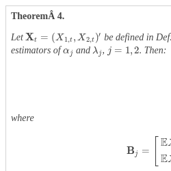 \[\begin{aligned}{}{\mathbf{B}_{j}}& ={\left[\begin{array}{c@{\hskip10.0pt}c}\mathbb{E}{X_{j,t}^{2}}& \mathbb{E}{X_{j,t}}\\ {} \mathbb{E}{X_{j,t}}& 1\end{array}\right]^{-1}}{\mathbf{A}_{j}}{\left[\begin{array}{c@{\hskip10.0pt}c}\mathbb{E}{X_{j,t}^{2}}& \mathbb{E}{X_{j,t}}\\ {} \mathbb{E}{X_{j,t}}& 1\end{array}\right]^{-1}},\\ {} {\mathbf{A}_{j}}& ={\alpha _{j}}(1-{\alpha _{j}})\left[\begin{array}{c@{\hskip10.0pt}c}\mathbb{E}{X_{j,t}^{3}}& \mathbb{E}{X_{j,t}^{2}}\\ {} \mathbb{E}{X_{j,t}^{2}}& \mathbb{E}{X_{j,t}}\end{array}\right]+{\sigma _{j}^{2}}\left[\begin{array}{c@{\hskip10.0pt}c}\mathbb{E}{X_{j,t}^{2}}& \mathbb{E}{X_{j,t}}\\ {} \mathbb{E}{X_{j,t}}& 1\end{array}\right],\hspace{1em}j=1,2.\end{aligned}\]