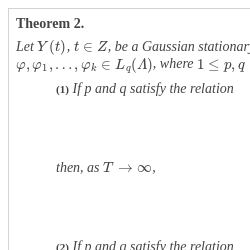 Let $Y(t)$, $t\in Z$, be a Gaussian stationary process with a spectral density $f(\lambda )\in L_{p}(\varLambda )$, and let the functions $\varphi _{1},\dots ,\varphi _{m}\in L_{q}(\varLambda )$, where $1\le p,q\le \infty $, be such that $\frac{1}{q}+\min \{k_{i}\}\frac{1}{p}=\frac{1}{2}$. Suppose also that Assumption H holds. Then