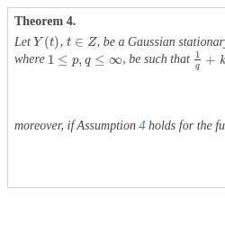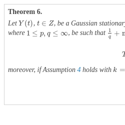 Let $Y(t)$, $t\in Z$, be a Gaussian stationary process with spectral density $f(\lambda )$, $\lambda \in \varLambda $, such that $f(\lambda )\in L_{p}(\varLambda )$, and let the functions $\varphi ,\varphi _{1},\dots ,\varphi _{k}\in L_{q}(\varLambda )$, where $1\le p,q\le \infty $. Suppose also that Assumption H holds.