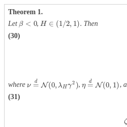 \[ \frac{{e^{-\beta T}}}{2\beta }({\widehat{\beta }_{T}}-\beta )\xrightarrow{d}\frac{X\sqrt{\sin \pi H}}{Y},\hspace{1em}\text{as}\hspace{2.5pt}T\to \infty ,\]