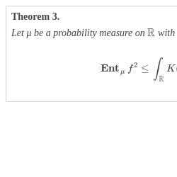\[\operatorname{\mathbf{Ent}}_{\mu }{f}^{2}=\int _{{\mathbb{R}}^{d}}{f}^{2}\log {f}^{2}\hspace{0.1667em}d\mu -\bigg(\int _{{\mathbb{R}}^{d}}{f}^{2}\hspace{0.1667em}d\mu \bigg)\log \bigg(\int _{{\mathbb{R}}^{d}}{f}^{2}\hspace{0.1667em}d\mu \bigg),\]