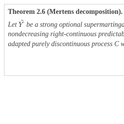 • ${Y_{t+}}=\underset{s\searrow t}{\lim }{Y_{s}}$ the right-hand limit of Y at $t\in [0,T]$, $({Y_{T+}}={Y_{T}})$, ${Y_{+}}:={({Y_{t+}})_{t\le T}}$ and ${\Delta _{+}}{Y_{t}}:={Y_{t+}}-{Y_{t}}$ the size of the right jump of Y at t.