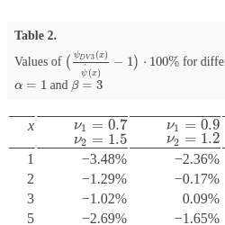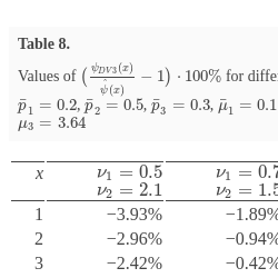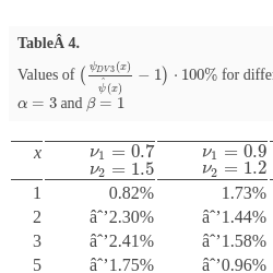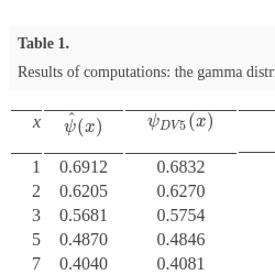 Table 7 presents the results of computations for some values of x, whereas Table 8 shows the values of $\left(\frac{{\psi _{DV3}}(x)}{\hat{\psi }(x)}-1\right)\cdot 100\% $ for the three-moment approximations constructed using conditions (39) for different ${\nu _{1}}$ and ${\nu _{2}}$.