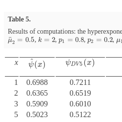 Table 5 presents the results of computations for some values of x, whereas Table 6 shows the values of $\left(\frac{{\psi _{DV3}}(x)}{\hat{\psi }(x)}-1\right)\cdot 100\% $ for the three-moment approximations constructed using conditions (39) for different ${\nu _{1}}$ and ${\nu _{2}}$.