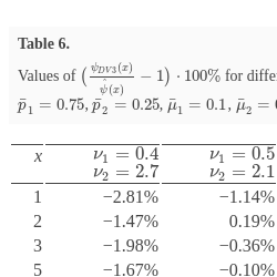 Values of $\big(\frac{{\psi _{DV3}}(x)}{\hat{\psi }(x)}-1\big)\cdot 100\% $ for different ${\nu _{1}}$ and ${\nu _{2}}$: the hyperexponential distributions for the premium and claim sizes, $\bar{k}=2$, ${\bar{p}_{1}}=0.75$, ${\bar{p}_{2}}=0.25$, ${\bar{\mu }_{1}}=0.1$, ${\bar{\mu }_{2}}=0.5$, $k=2$, ${p_{1}}=0.8$, ${p_{2}}=0.2$, ${\mu _{1}}=2.8$ and ${\mu _{2}}=3.8$