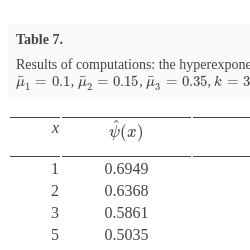 Results of computations: the hyperexponential distributions for the premium and claim sizes, $\bar{k}=3$, ${\bar{p}_{1}}=0.2$, ${\bar{p}_{2}}=0.5$, ${\bar{p}_{3}}=0.3$, ${\bar{\mu }_{1}}=0.1$, ${\bar{\mu }_{2}}=0.15$, ${\bar{\mu }_{3}}=0.35$, $k=3$, ${p_{1}}=0.1$, ${p_{2}}=0.4$, ${p_{3}}=0.5$, ${\mu _{1}}=1$, ${\mu _{2}}=2.7$ and ${\mu _{3}}=3.64$