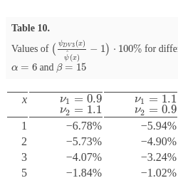 Table 9 presents the results of computations for some values of x, whereas Table 10 shows the values of $\left(\frac{{\psi _{DV3}}(x)}{\hat{\psi }(x)}-1\right)\cdot 100\% $ for the three-moment approximations constructed using conditions (39) for different ${\nu _{1}}$ and ${\nu _{2}}$.