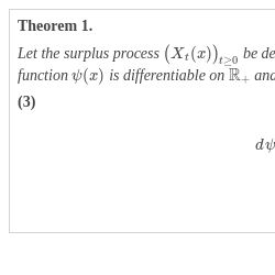 Let the surplus process ${\big({X_{t}}(x)\big)_{t\ge 0}}$ be defined by (1) under the above assumptions, and let ${F_{Y}}(y)$ be continuous on ${\mathbb{R}_{+}}$. Then the function $\psi (x)$ is differentiable on ${\mathbb{R}_{+}}$ and satisfies the integro-differential equation