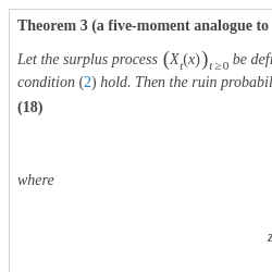 From the assertion of Theorem 3 it is clear that its conditions are quite restrictive. In particular, some of the parameters ${\bar{\lambda }_{0}}$, ${\bar{\mu }_{0}}$, ${\lambda _{0}}$, ${\mu _{0}}$ and ${d_{0}}$ can be negative, and numerical computations show that such situations happen quite often. Hence, it is impossible to construct the five-moment approximation in those cases. Namely for this reason we also consider a simplified three-moment analogue to the De Vylder approximation. To construct it, we replace the process ${\big({U_{t}}\big)_{t\ge 0}}$ by the process ${\big({\tilde{U}_{t}}\big)_{t\ge 0}}$ with exponentially distributed premium and claim sizes such that