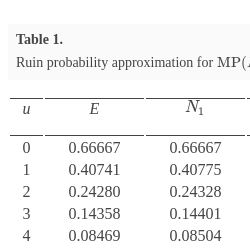 In this example we assume claims have a $\text{MP}({F_{\Lambda }})$ distribution with $\Lambda \sim \text{Erlang}(2,3)$. In this case, $𝔼(\Lambda )=2/3$. Table 1 below shows the results of the approximations. Columns E, ${N_{1}}$, ${N_{2}}$ and PK show, for each value of u, the exact value of $\psi (u)$, the approximation with the first method, the approximation with the second method, and the approximation with the Pollaczeck–Khinchine method, respectively. Relative errors $(\hat{\psi }-\psi )/\psi $ are also shown. The left-hand side plot of Figure 2 shows the values of u against E, ${N_{1}}$, ${N_{2}}$ and PK. The right-hand side plot shows the values of u against the relative errors.