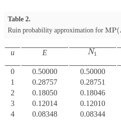 The expression $\psi (u)=ℙ\left({\textstyle\sum _{i=1}^{K}}{Y_{i}^{\ast }}\ge u\right)$, given in (25), produces another approximation method due to the Law of Large Numbers. This approximation method is well known in the classical model of Cramér–Lundberg [1, page 465], and it is easily applied in our discrete model. Indeed, for large values of m,