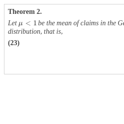 □For example, suppose claims have a $\text{Geometric}(p)$ distribution with mean $\mu =(1-p)/p$. The net profit condition $\mu <1$ implies $p>1/2$. We have seen in equation (11) that the associated equilibrium distribution is again $\text{Geometric}(p)$, and hence the k-th convolution is Negative Binomial with parameters $k\in \mathbb{N} $ and $p\in (1/2,1)$. Straightforward calculations show that the Pollaczeck–Khinchine formula gives the known solution for the probability of ruin,