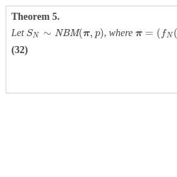 It is useful to observe that any NBM distribution can be written as a compound sum of geometric random variables. Indeed, let N be a discrete random variable with the probability function ${q_{k}}={f_{N}}(k)$, $k\ge 1$, and define ${S_{N}}={\textstyle\sum _{i=1}^{N}}{X_{i}}$, where ${X_{1}},{X_{2}},\dots $ are i.i.d. r.v.s $\text{Geometric}(p)$-distributed and independent of N. Then, conditioning on the values of N,
