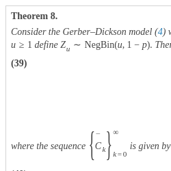 \[ \psi (u)\approx {\sum \limits_{k=0}^{\infty }}{\overline{C}_{k,n}}\cdot \textit{nb}(u,1/(1+n))(k),\](59)