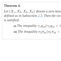 where ${\sigma _{1}}>{\sigma _{2}}>0$, ${\sigma _{3}}>{\sigma _{4}}>0$, and $\delta ,\varepsilon >0$. Let $\nu =({\nu _{1}},{\nu _{2}})$ be the eigenvector of ${\Sigma ^{12}}{\Sigma ^{21}}$ associated with the largest eigenvalue. We will argue that the inequality in Theorem 4(ii) holds if and only if $\delta \le \varepsilon $. Then the same theorem implies that $({X_{1}^{2}}+{X_{2}^{2}},{X_{3}^{2}}+{X_{4}^{2}})$ is infinitely divisible whenever $\delta \le \varepsilon $. On the other hand, Theorem 1 implies that $({X_{1}^{2}},{X_{2}^{2}},{X_{3}^{2}},{X_{4}^{2}})$ is never infinite divisible under (11) since there does not exist a matrix D of the form $\operatorname{diag}(\pm 1,\pm 1,\pm 1,\pm 1)$ such that $D{\Sigma ^{-1}}D$ has nonpositive off-diagonal elements. Indeed, for any two matrices ${D_{1}}$ and ${D_{2}}$ of the form $\operatorname{diag}(\pm 1,\pm 1)$, ${D_{1}}{\Sigma ^{12}}{D_{2}}$ has either three negative and one positive or one negative and three positive entries.