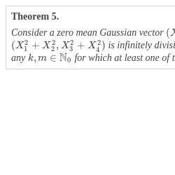 \[ ({d_{1}}{X_{1}^{2}}+\cdots +{d_{{n_{1}}}}{X_{{n_{1}}}^{2}},{d_{{n_{1}}}}{X_{{n_{1}}+1}^{2}}+\cdots +{d_{{n_{1}}+{n_{2}}}}{X_{{n_{1}}+{n_{2}}}^{2}})\]The following theorem, which is due to Griffiths [8] and Bapat [1], is an important first result related to infinite divisibility in the second Wiener chaos. We refer to [12, Theorem 13.2.1 and Lemma 14.9.4] for a proof.