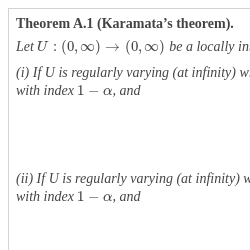 \[ \underset{x\to \infty }{\lim }\frac{\mathbb{P}(\varepsilon >qx)}{\mathbb{P}(\varepsilon >x)}={q^{-\alpha }}\hspace{2em}\text{for all}\hspace{5pt}q\in (0,\infty )\text{,}\]