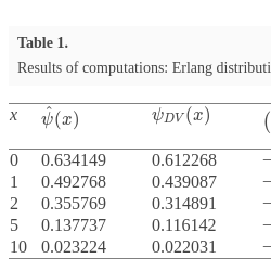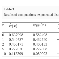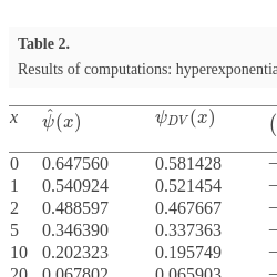 | x | $\hat{\psi }(x)$ | $\psi _{DV}(x)$ | $\big(\frac{\psi _{DV}(x)}{\hat{\psi }(x)}-1\big)\cdot 100\% $ | ${e}^{-\hat{R}x}$ | $\big(\frac{{e}^{-\hat{R}x}}{\hat{\psi }(x)}-1\big)\cdot 100\% $ |
