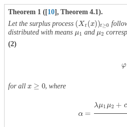 \[\varphi (x)=1+\frac{\lambda \mu _{1}(1-\alpha \mu _{2})}{(c\alpha -\lambda )(1-\alpha \mu _{2})(\mu _{1}+\mu _{2})+\lambda \mu _{2}}\hspace{0.1667em}{e}^{\alpha x}\]Remark 1 ([10], Remark 4.1).