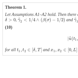 for all ${t_{1}},{t_{2}}\in [\delta ,T]$, ${x_{1}},{x_{2}}\in [0,L]$ and for some ${L_{\tilde{u}}}(\omega )>0$.