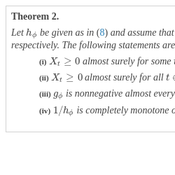 \[ x+\lambda -\xi {e^{-\tau x}}\cos (\tau y)=0\hspace{2em}\text{and}\hspace{2em}y+\xi {e^{-\tau x}}\sin (\tau y)=0\]Turning to the question of whether a given solution ${({X_{t}})_{t\in \mathbb{R}}}$ to (7) is nonnegative, we observe initially that, since it will necessarily take the form (9), there exist a number of equivalent statements for nonnegativity; these are presented in Theorem 2 below. Before formulating the result, recall that a function $f:(0,\infty )\to \mathbb{R}$ is called completely monotone if it is infinitely differentiable and