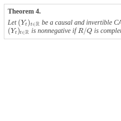 In other words, ${({X_{t}})_{t\in \mathbb{R}}}$ is a causal and invertible CARMA process with autoregressive polynomial P and moving average polynomial Q (see Section 3 or [8, Remark 4]). Conversely, given a moving average