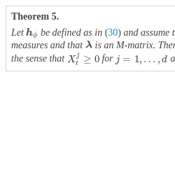 When comparing Theorem 5 to Theorem 3, it seems that we have to impose an additional assumption of $\boldsymbol{\lambda }$ being an M-matrix, which was not needed in the univariate case. However, requiring that the one-dimensional quantity $\lambda =-\phi (\{0\})$ is an M-matrix would naturally be interpreted as a nonnegativity constraint, but this is automatically satisfied under the stated assumptions on ${h_{\phi }}$, cf. Remark 3.