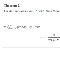 We conclude this section with a brief discussion on the obtained result: the logarithmic factor ${(\log n)}^{\ell }$ is negligible for practical purposes. If $\kappa =1$, then the posterior contraction rate obtained in Theorem 2 is essentially ${n}^{-2\beta /(2\beta +d)}$, which is the minimax estimation rate in a number of nonparametric settings. This is arguably also the minimax estimation rate in our problem as well (cf. Theorem 2.1 in [16] for a related result in the one-dimensional setting), although here we do not give a formal argument. Equally important is the fact that our result is adaptive: the posterior contraction rate in Theorem 2 is attained without the knowledge of the smoothness level β being incorporated in the construction of our prior Π. Finally, Theorem 2, in combination with Theorem 2.5 and the arguments on pp. 506–507 in [15], implies the existence of Bayesian point estimates achieving (in the frequentist sense) this convergence rate.