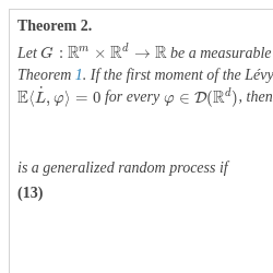 This shows that the term (12) converges to 0 as ${\varphi _{n}}\to 0$ in $\mathcal{D}({\mathbb{R}^{d}})$ and the rest of the proof follows from similar arguments as mentioned in the proof of Theorem 1. □When ${G_{R}}\notin {L^{1}}({\mathbb{R}^{m}})$ we can still obtain a generalized process s under some extra conditions. Similar to Theorem 3.5 in [2] we obtain the following result in a more general case.