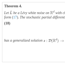 The characteristic functional characterizes the law of s in the sense that two random processes are equal in law if and only if they have the same characteristic functional. Now we define the Lévy white noise, which is closely connected to a Lévy process. In general, a Lévy process is a stochastically continuous process with independent and stationary increments starting in 0. A Lévy process ${({L_{t}})_{t\ge 0}}$ is characterized by its characteristic function