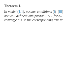 assuming condition (iii) which states that ${\sigma _{\delta }^{2}}$ and ${\sigma _{u}^{2}}$ are known. For model (3.10), we assume also (i), (ii) and impose two additional assumptions.Theorem 1 implies that a strongly consistent estimator