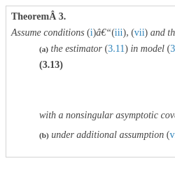 Since ε, x, δ, u have finite 4th moments, B is well defined.The unbiasedness of $s(\theta ;w,y)$, consistency of $\widehat{\theta }$ and nonsingularity of V imply (3.13) by Theorem A.26 from [4], and ${\Sigma ^{\theta }}$ can be found by the sandwich formula