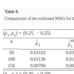 \[\begin{array}{l}\displaystyle {E_{}}[{(\widehat{\mu }-\mu )^{2}}]=\frac{{\sigma ^{2}}{({\rho _{1}}+{\rho _{2}}+1)^{2}}}{n}+o({n^{-1}}),\hspace{1em}{E_{}}[{(\widehat{\sigma }-\sigma )^{2}}]=\frac{{\sigma ^{2}}}{2n}+o({n^{-1}}),\\ {} \displaystyle {E_{}}[{({\widehat{\rho }_{1}}-{\rho _{1}})^{2}}]=\frac{1-{\rho _{2}^{2}}}{n}+o({n^{-1}}),\hspace{1em}{E_{}}[{({\widehat{\rho }_{2}}-{\rho _{2}})^{2}}]=\frac{1-{\rho _{2}^{2}}}{n}+o({n^{-1}}),\\ {} \displaystyle {E_{}}[({\widehat{\rho }_{1}}-{\rho _{1}})({\widehat{\rho }_{2}}-{\rho _{2}})]=\frac{{\rho _{1}}(1-{\rho _{2}})}{n}+o({n^{-1}}).\end{array}\]