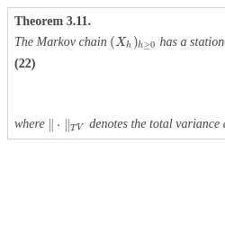 From Proposition 3.10 we know that $({X_{h}})$ is an aperiodic recurrent Harris chain. By Theorem 6.8.5 in [8, p. 323] this chain has a stationary measure. By Theorem 6.8.8 in [8, p. 324] an aperiodic recurrent Harris chain converges to a stationary distribution in the total variation distance as (22) if ${R_{{B_{1}}(0)}}$ is almost surely finite. The latter is secured by Theorem 3.3. □