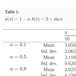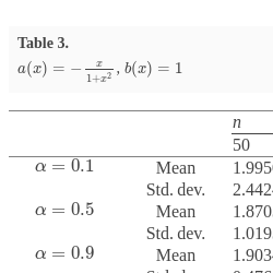 | $\alpha =0.5$ | Mean | 1.87038 | 1.87897 | 1.89022 | 1.92593 | 1.94964 | 1.96624 |