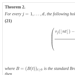 \[ {\left(\frac{{\tau _{j}}(\lfloor nt\rfloor )-{\tau _{j-1}}(\lfloor nt\rfloor )-{({\mu _{j}^{({\mathbf{s}_{j-1}})}})^{-1}}{b_{j}^{(\lfloor nt\rfloor )}}}{{({\mu _{j}^{({\mathbf{s}_{j-1}})}})^{-3/2}}{({v_{j,j}^{({\mathbf{s}_{j-1}})}}{b_{j}^{(n)}})^{1/2}}}\right)_{t>0}}\stackrel{\mathrm{d}}{\underset{n\to \infty }{\Longrightarrow }}{(B({t^{{\rho _{j}}}}))_{t>0}}\]Remark 3.