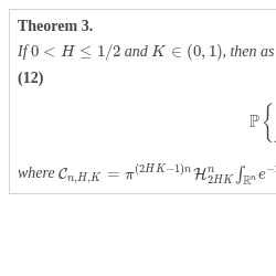 \[\begin{aligned}{}& {\rho _{K}^{-1}}{\sum \limits_{j,l=1}^{n}}{\lambda _{j}}{\lambda _{l}}R\left({M_{j}},{M_{l}}\right)\\ {} & \hspace{1em}={\sum \limits_{j,l=1}^{n}}{\lambda _{j}}{\lambda _{l}}{\int _{0}^{\infty }}\frac{du}{{u^{K+1}}}\left({e^{-u{d^{2H}}({M_{j}},{M_{l}})}}-{e^{-u({d^{2H}}(O,{M_{j}})+{d^{2H}}(O,{M_{l}}))}}\right)\\ {} & \hspace{1em}={\int _{0}^{\infty }}\frac{du}{{u^{K+1}}}{\sum \limits_{j,l=1}^{n}}{\lambda _{j}}{\lambda _{l}}\left(1+{e^{-u{d^{2H}}({M_{j}},{M_{l}})}}-{e^{-u{d^{2H}}(O,{M_{j}})}}-{e^{-u{d^{2H}}(O,{M_{l}})}}\right)\\ {} & \hspace{2em}-{\int _{0}^{\infty }}\frac{du}{{u^{K+1}}}{\sum \limits_{j,l=1}^{n}}{\lambda _{j}}{\lambda _{l}}\left(1-{e^{-u{d^{2H}}(O,{M_{j}})}}\right)\left(1-{e^{-u{d^{2H}}(O,{M_{l}})}}\right)\\ {} & \hspace{1em}={\int _{0}^{\infty }}\frac{du}{{u^{K+1}}}{\sum \limits_{j,l=1}^{n}}{\lambda _{j}}{\lambda _{l}}\left(1+{e^{-u{d^{2H}}({M_{j}},{M_{l}})}}-{e^{-u{d^{2H}}(O,{M_{j}})}}-{e^{-u{d^{2H}}(O,{M_{l}})}}\right)\\ {} & \hspace{2em}-{\int _{0}^{\infty }}\frac{du}{{u^{K+1}}}{\left|{\sum \limits_{j=1}^{n}}{\lambda _{j}}\left(1-{e^{-u{d^{2H}}(O,{M_{j}})}}\right)\right|^{2}}.\end{aligned}\]