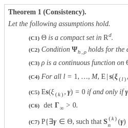 \[ {\boldsymbol{\Gamma }_{\infty }}=\underset{n\to \infty }{\lim }\frac{1}{n}{\mathbf{p}_{;n}^{T}}{\mathbf{p}_{;n}}\]For a vector x, the symbol $|\mathbf{x}|$ means the Euclidean norm. For a matrix A, $|\mathbf{A}|$ is the operator norm. Let $\boldsymbol{\psi }(\mathbf{x},\boldsymbol{\gamma })$ be any function of $\mathbf{x}\in {\mathbb{R}^{D}}$, $\boldsymbol{\gamma }\in \Theta $, maybe vector- or matrix-valued, $h:{\mathbb{R}^{D}}\to \mathbb{R}$, $\rho :\Theta \times \Theta \to \mathbb{R}$. We say that $\boldsymbol{\psi }$ satisfy Condition ${\boldsymbol{\Psi }_{h,\rho }}$ iff, for all ${\boldsymbol{\gamma }_{1}},{\boldsymbol{\gamma }_{2}}\in \Theta $ and all $\mathbf{x}\in {\mathbb{R}^{D}}$,