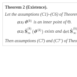 \[ \underset{i=1,\dots ,n}{\sup }|{\hat{\boldsymbol{\vartheta }}_{-in}^{(k)}}-{\boldsymbol{\vartheta }^{(k)}}|\stackrel{\text{P}}{\longrightarrow }0\]Assumptions (C7) and (C7’) claim the existence of GEE solutions with probability tending to 1 as $n\to \infty $. They seem rather imperfect. The following theorem provides conditions under which they hold.