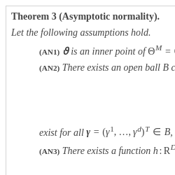 (AN2) There exists an open ball B centered in $\boldsymbol{\vartheta }$, such that the derivatives\[ \frac{{\partial ^{2}}{s^{l}}(\mathbf{x},\boldsymbol{\gamma })}{\partial {\gamma ^{i}}\partial {\gamma ^{j}}}\]exist for all $\boldsymbol{\gamma }={({\gamma ^{1}},\dots ,{\gamma ^{d}})^{T}}\in B$, all $l,i,j=1,\dots ,d$, and almost all x (w.r.t. all ${F^{(k)}}$, $k=1,\dots ,M$).