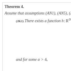 (AN3) There exists a function $h:{\mathbb{R}^{D}}\to \mathbb{R}$ such that\[ \underset{l,i,j}{\max }\underset{\boldsymbol{\gamma }\in B}{\sup }\left|\frac{{\partial ^{2}}{s^{l}}(\mathbf{x},\boldsymbol{\gamma })}{\partial {\gamma ^{i}}\partial {\gamma ^{j}}}\right|\le h(x)\]and $\operatorname{\mathsf{E}}{(h({\boldsymbol{\xi }_{(k)}}))^{\alpha }}<\infty $ for some $\alpha >1$ for all $k=1,\dots M$.