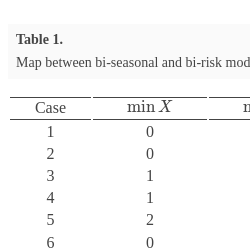 As mentioned previously, this article is based on the research done in [1] where the bi-seasonal model is studied. The relationship of the ultimate time survival probability expressions between bi-seasonal and bi-risk models is given in Table 1.
