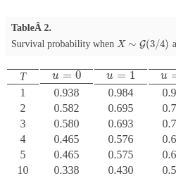 | T | $u=0$ | $u=1$ | $u=2$ | $u=3$ | $u=4$ | $u=5$ | $u=10$ | $u=25$ | $u=50$ |