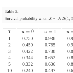 | T | $u=0$ | $u=1$ | $u=2$ | $u=3$ | $u=4$ | $u=5$ | $u=10$ | $u=25$ | $u=40$ |
